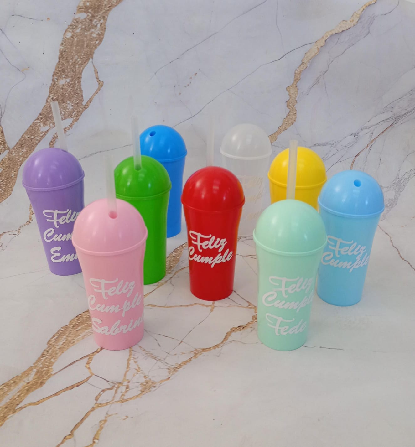 Vasos Plásticos 400cc Feliz Cumple con Tapa y Bombilla