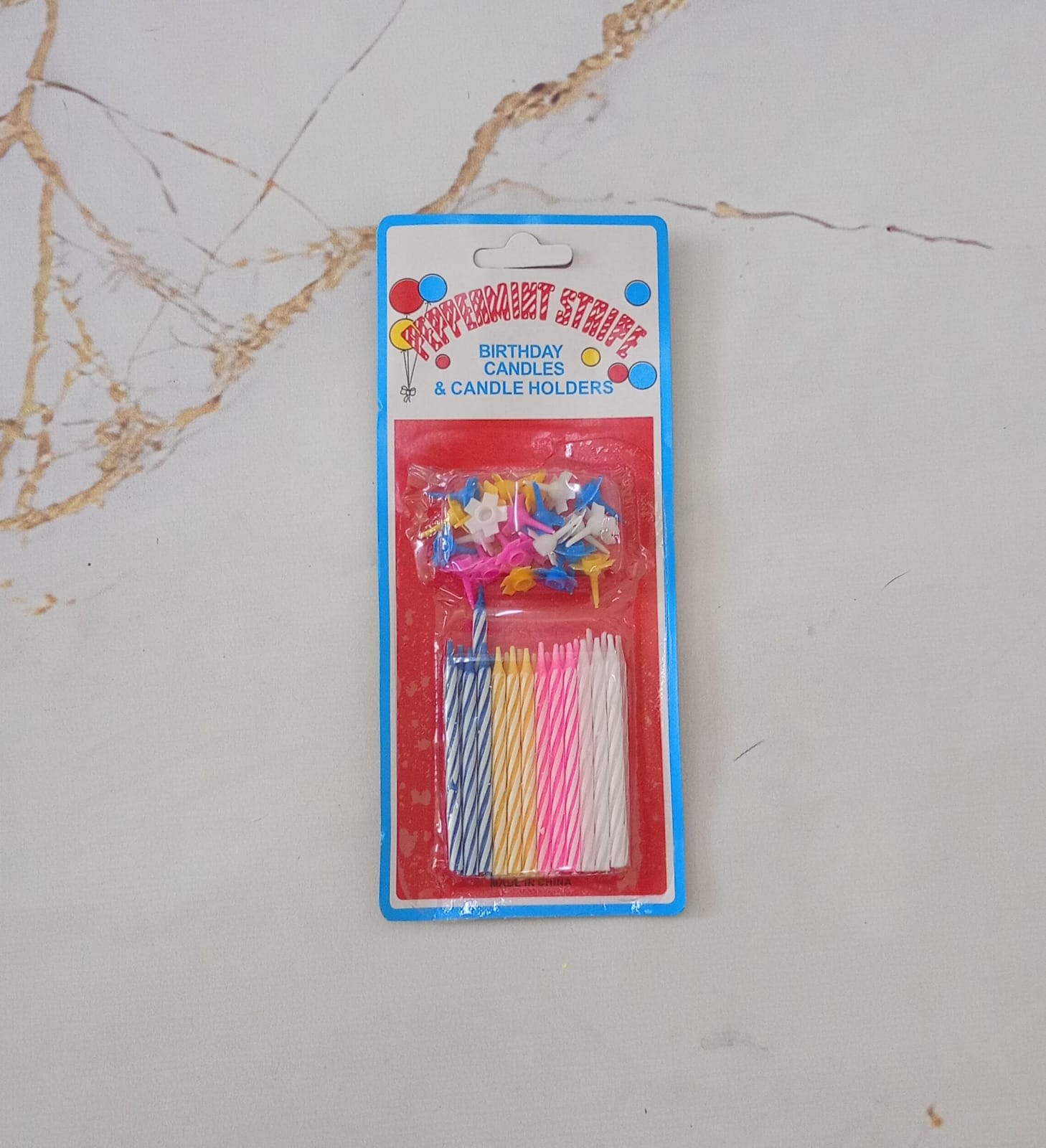 Velas Rayadas 5,5cm Rosa, Celeste, Blancas y Amarillas Blister x24u.